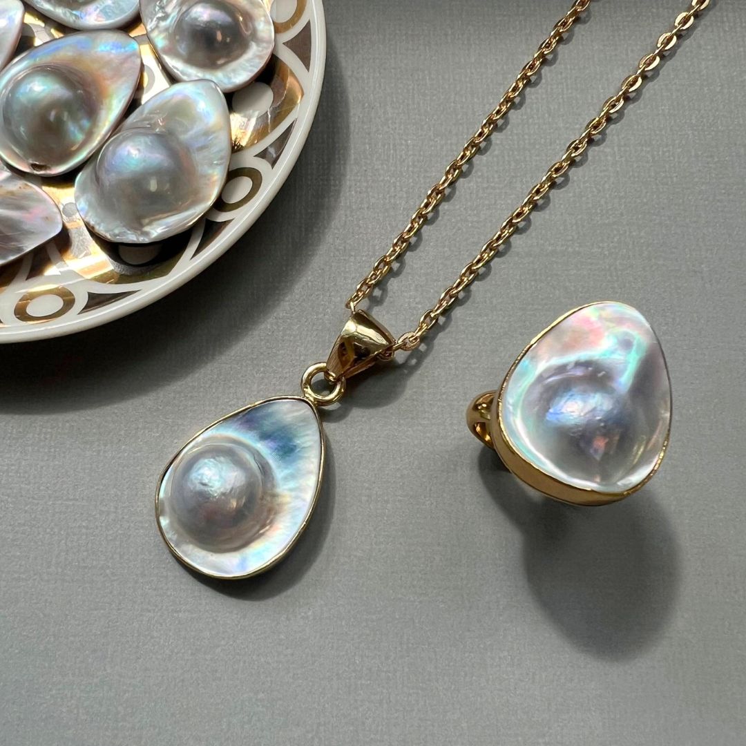 Mabe pearls, also known as blister pearls, are cultivated by attaching a small half-spherical nucleus to the inner shell of an oyster. Over time, the oyster coats the nucleus with nacre, resulting in a pearl with a flat back and a domed front. Mabe pearls are prized for their large size and lustrous appearance. Mabe Pearls add a touch of sophistication to any jewelry collection.