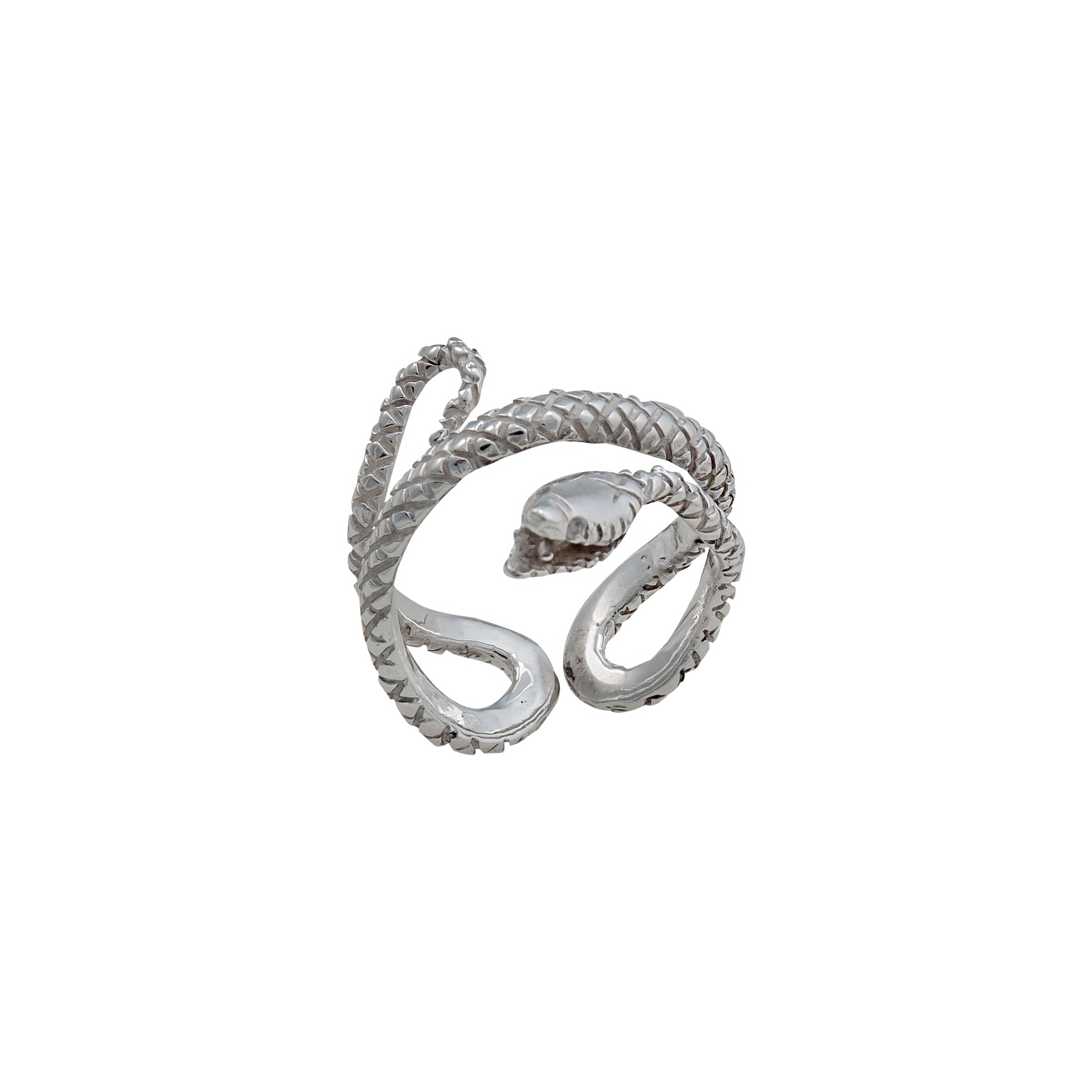 Crafted from lustrous sterling silver, this snake-inspired adjustable cuff ring combines elegance with a bold design. Its flexible fit ensures comfort while making a refined statement, perfect for those who appreciate sophisticated, unique jewelry.