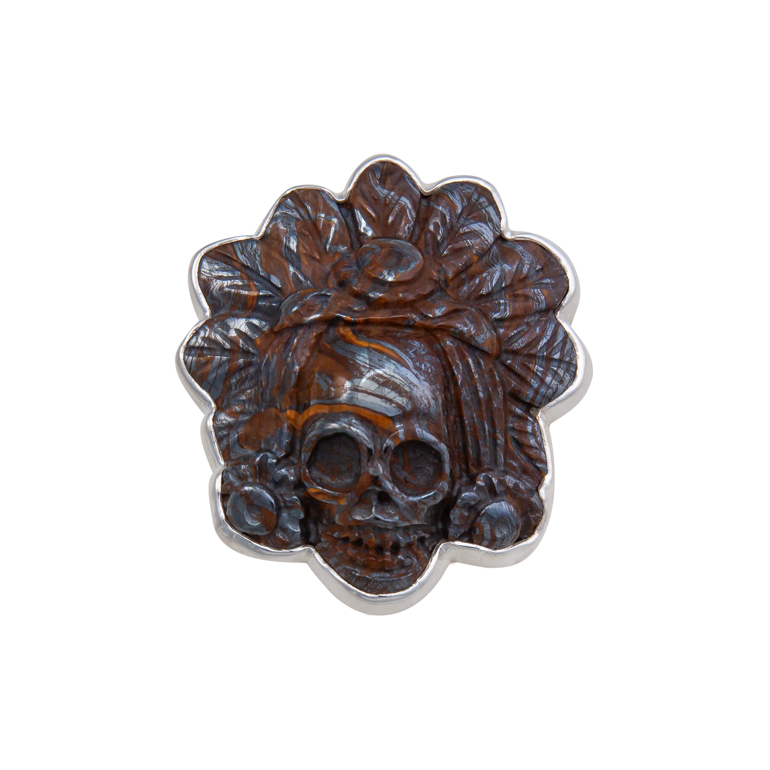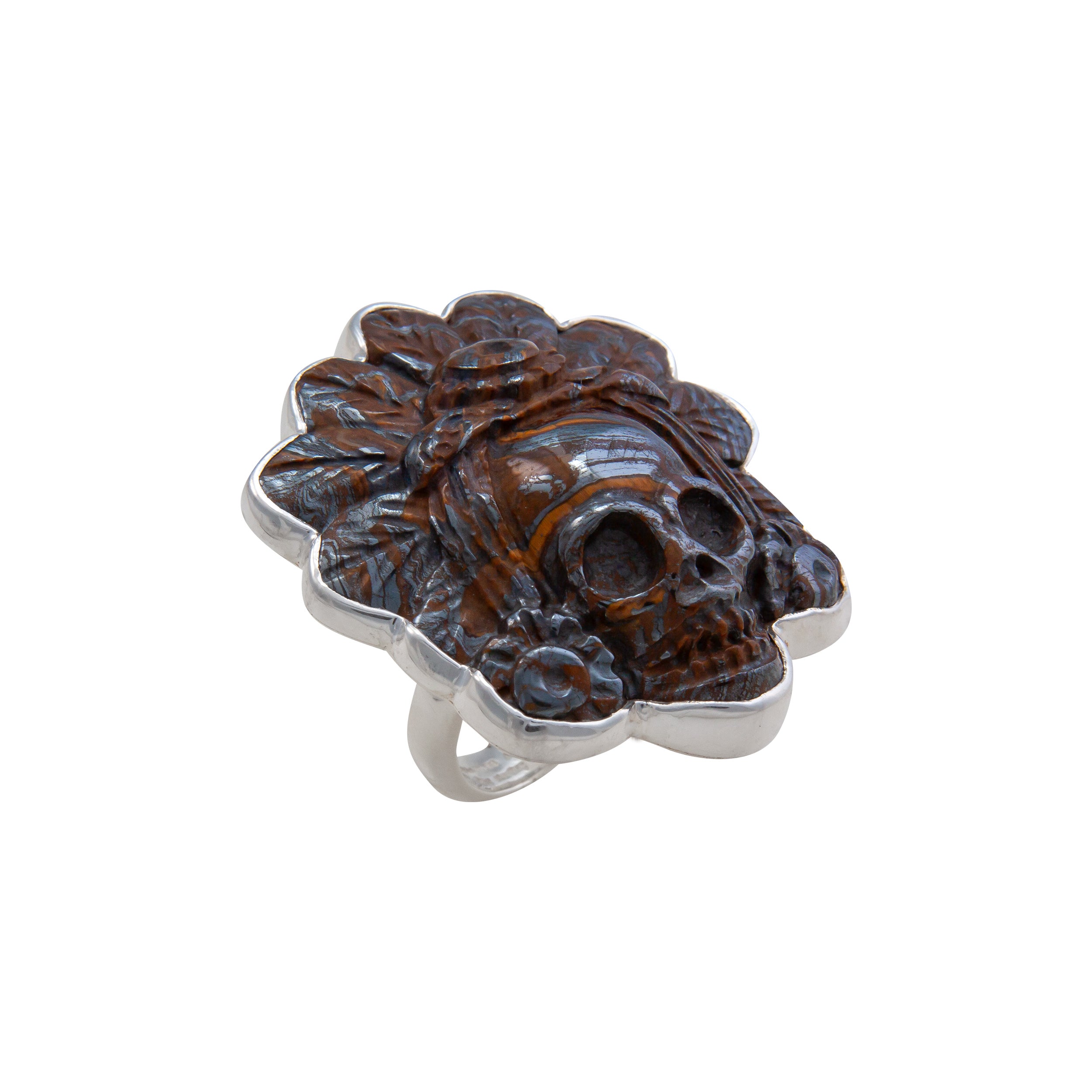 Embody bold elegance with this Sterling Silver Tiger Eye Headdress Skull Adjustable Ring. Crafted from sterling silver, it features an intricately detailed skull adorned with a striking tiger eye stone headdress. The adjustable design ensures a comfortable fit, making it a distinctive accessory that elevates your style with a sophisticated edge. Perfect for those who appreciate unique craftsmanship and timeless symbolism.
