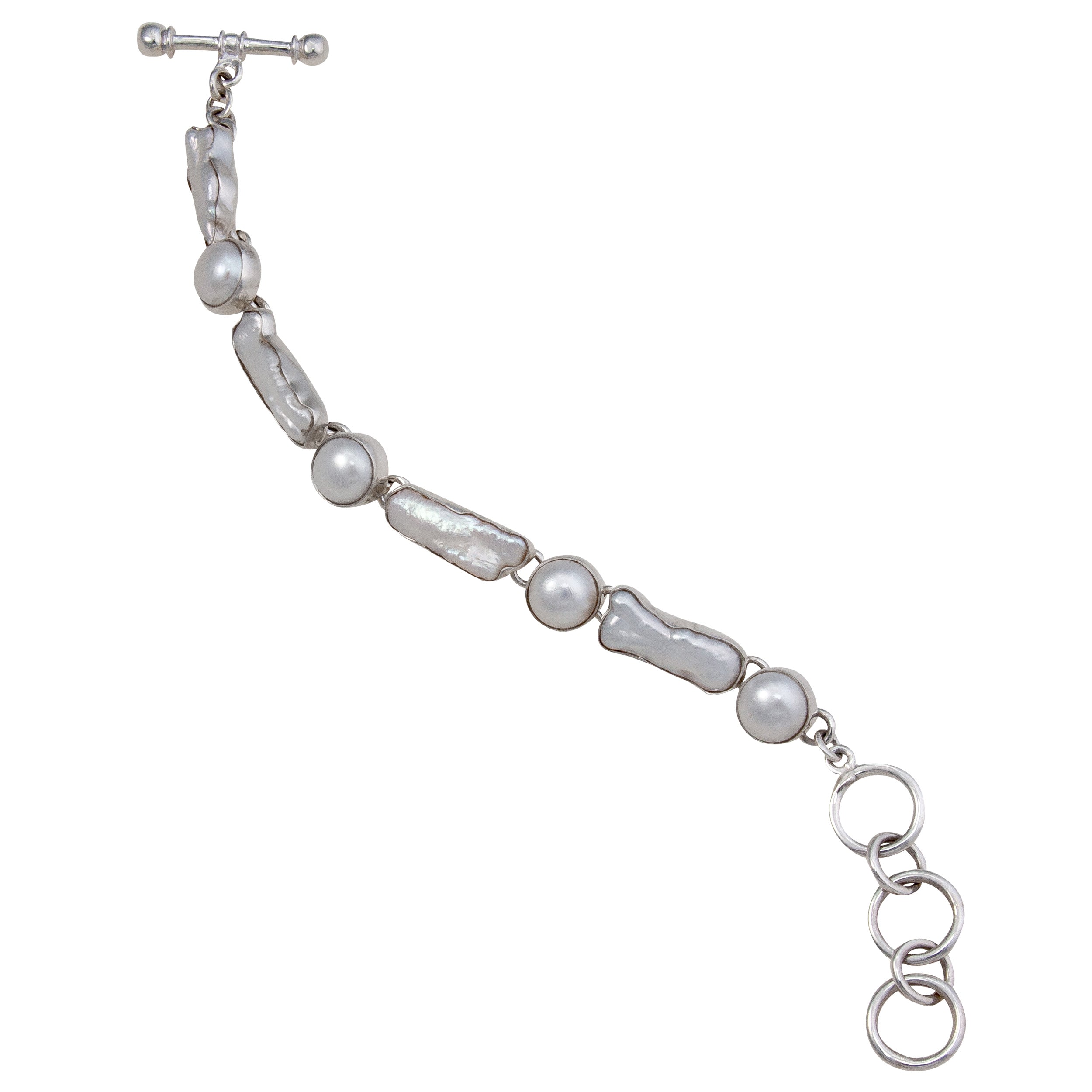 Elevate your elegance with this Sterling Silver Biwa Pearl and Pearl Bracelet. Featuring uniquely shaped Biwa pearls and classic pearls set in lustrous sterling silver, this bracelet offers a refined accessory that complements both formal and casual attire. Its timeless design enhances any ensemble with subtle sophistication and graceful charm.