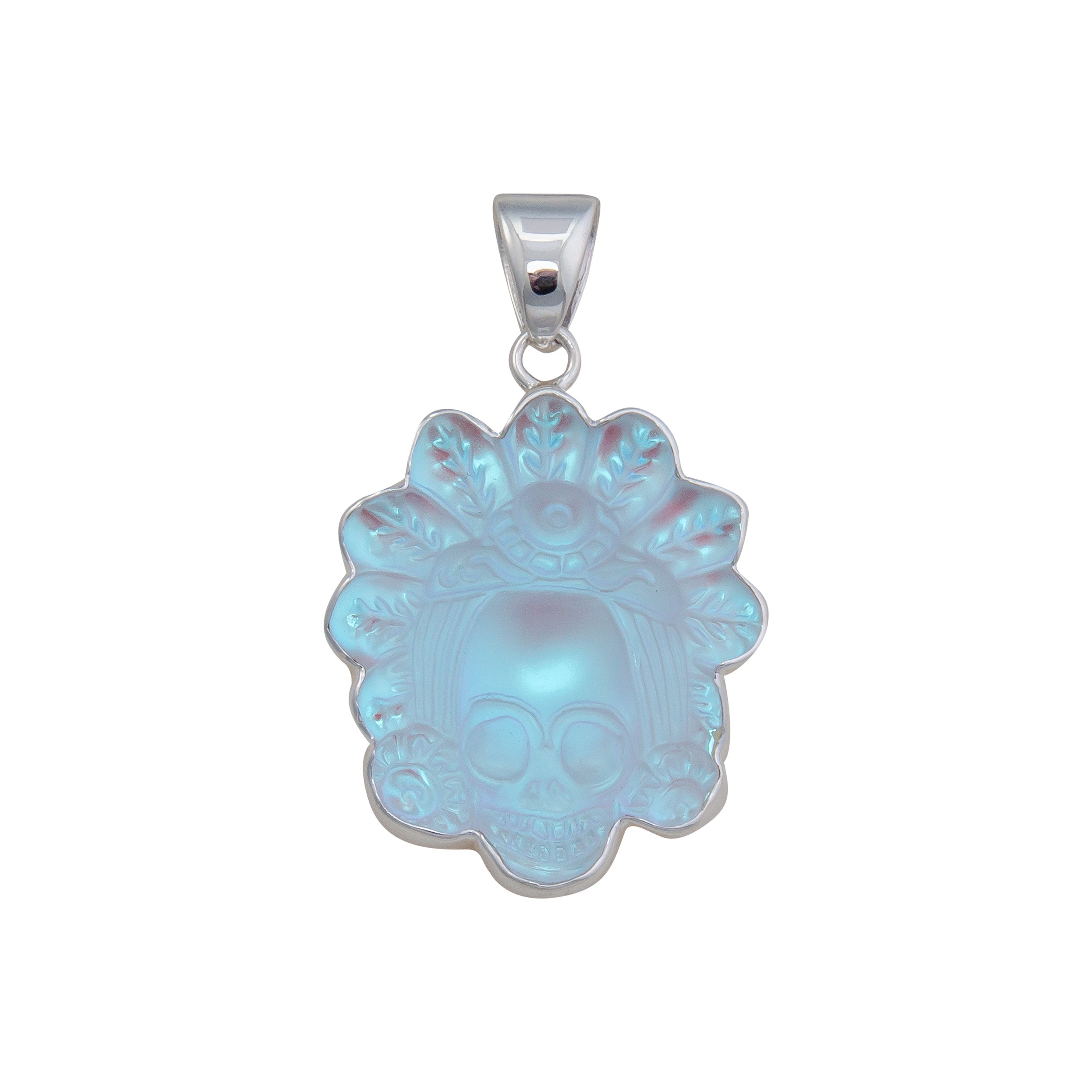 Crafted in sterling silver, this Luminite Headdress Skull Pendant combines intricate artistry with a bold statement. The luminous inlay highlights the detailed headdress design, creating a striking contrast that enhances its unique character. Perfect for those seeking a refined accessory that blends edgy symbolism with timeless elegance.